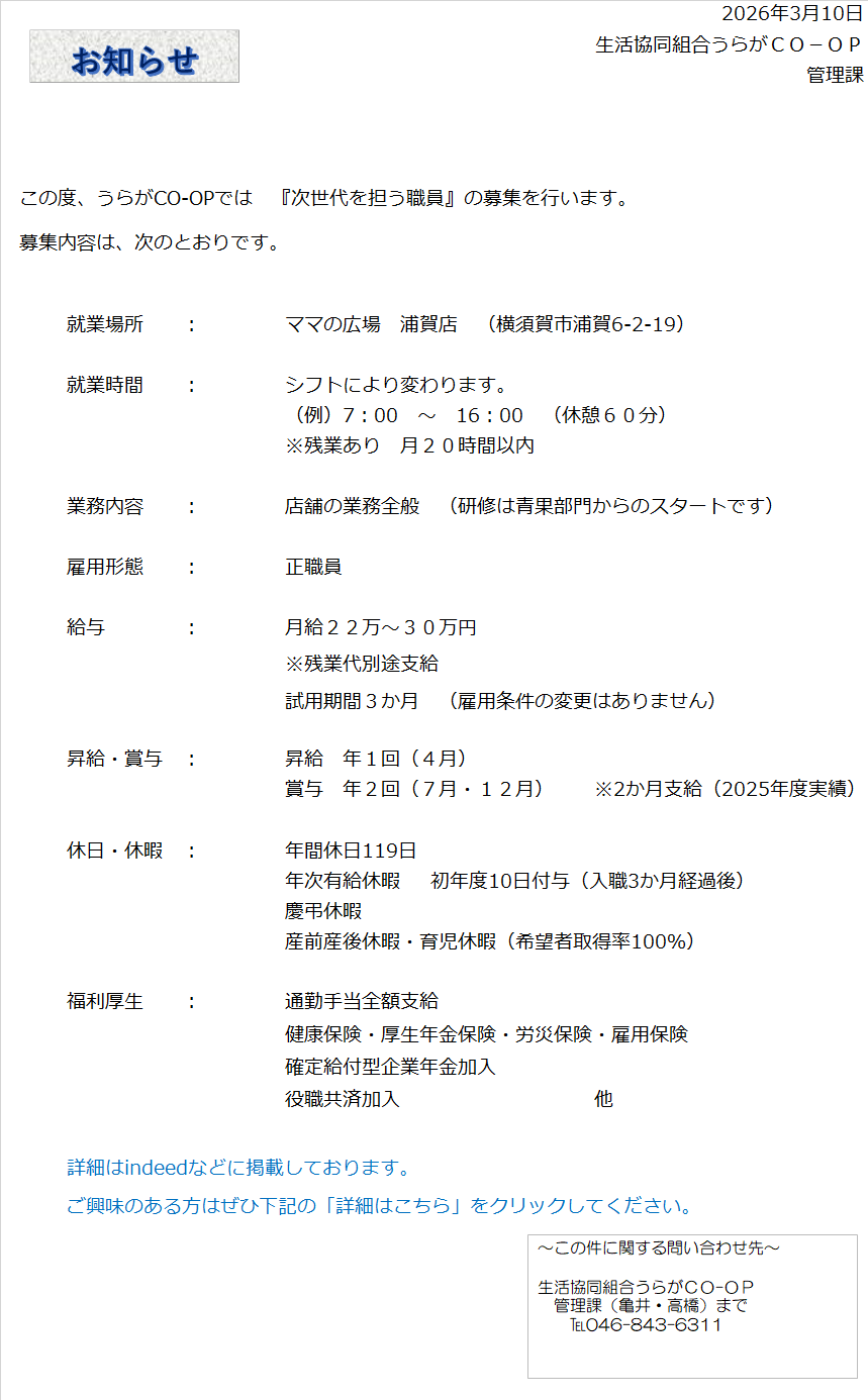 うらがCO‐OPでは以下のお店・センターで、パートさん・アルバイトさんの募集を行っています。